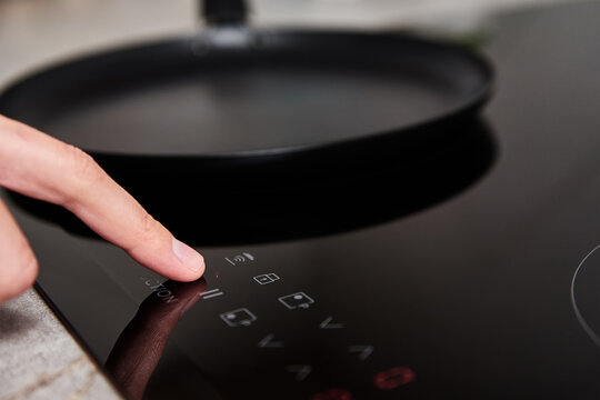 Modern kitchen appliance. Woman hand turn on induction stove to cook. Finger touching sensor button on induction or electrical hob