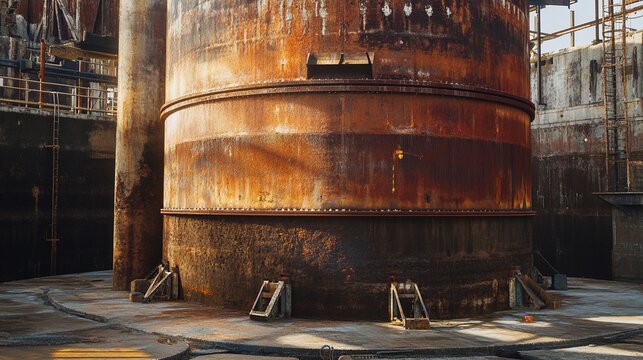 hydrologic. Massive steel caisson supported by jacks in an industrial dry dock setting. safety posters, maintenance manuals, designed for precision metalworking and fabrication facilities.