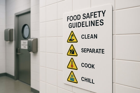Wall sign showing essential food safety guidelines for food engineering quality assurance systems in hygienic processing environments to prevent contamination risks