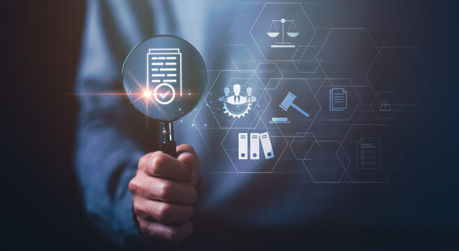 Businessman checking the steps through document with a list of checkboxes ,regulation ,Concepts of practices and policies ,procedure company articles of association Terms and Conditions