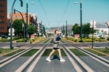 Side view of trendy woman in stylish suit with black notebook fast crossing road looking around