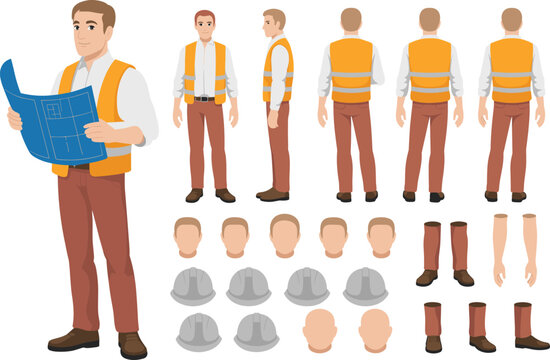 Male construction worker character set, man engineer in safety vest holding blueprint, architect illustration, professional builder design, laborer animation pack