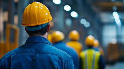 Workers in Hard Hats with Oil Rig Silhouette Against Dramatic Sunset Sky Over Industrial Landscape, Capturing the Essence of Labor and Industry