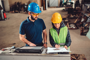 Teamwork professional engineering wearing uniform safety and helmet with tablet working machine lathe metal, in heavy industry in factory.