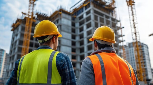 Two construction workers observe a building site, wearing safety gear and hard hats, with cranes and scaffolding in the background, illustrating the construction industry.