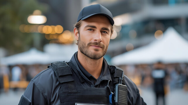 A police liaison and private security team collaborating during a crowded public event, symbolizing coordination, emergency preparedness, and teamwork between different safety services. cinematic