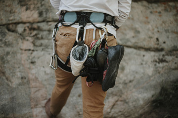 Rear view of man with climbing equipment