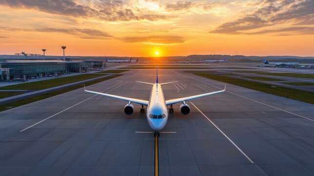 Airplane on Runway During Sunrise with Beautiful Sky Colors and Clouds