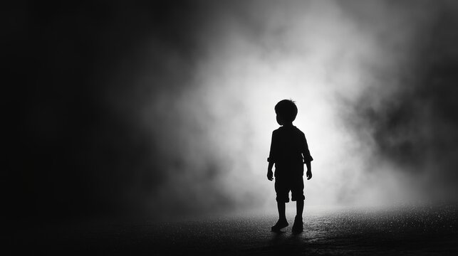 A young child standing alone in a fog-filled environment during twilight, creating a mysterious and contemplative atmosphere