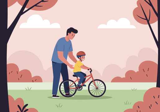 Father teaching son to ride a bicycle in a serene park setting illustrative style warm autumn environment