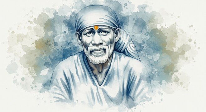 Portrait of a wise sai baba with a serene expression, surrounded by a watercolor background, symbolizing wisdom