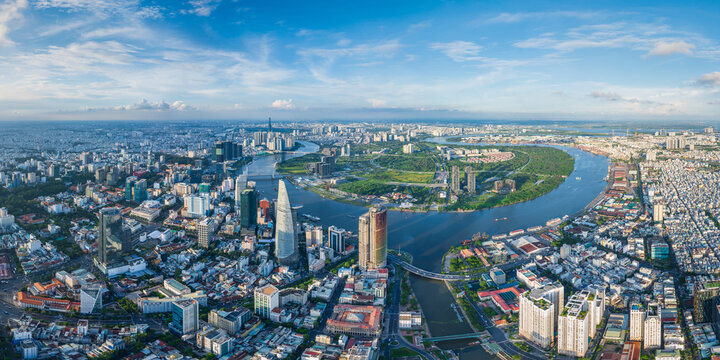 Aerial panorama skyline view of Ho Chi Minh city, Saigon during beautiful day. Metropolis background in Asia