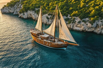 Rustic Wooden Sailboat Gliding Through a Tranquil Croatian Bay at Golden Sunset