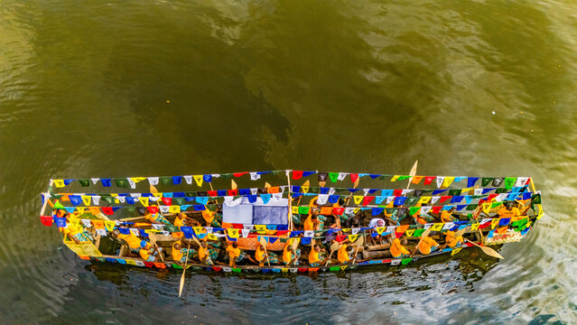 Aerial view of a vibrant boat adorned with colorful flags and people in yellow, gliding across the water, Buguma, Rivers State, Nigeria.