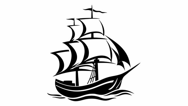 Silhouette illustration of a sailing ship with multiple sails on a wavy sea surface design is visible