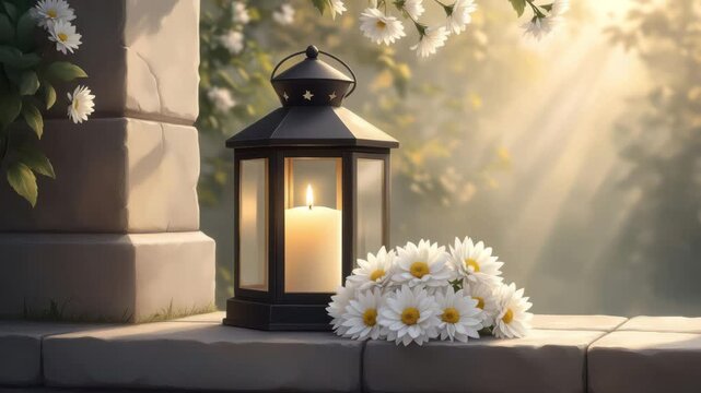 A black lantern with a lit candle beside a bouquet of white daisies. Soft sunlight filters through trees, creating a serene atmosphere.
