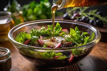 A close-up of a fresh salad being drizzled with olive oil, highlighting healthy ingredients. Concept: nutritious meal.