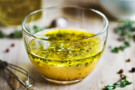 Woman hand pouring honey mustard dressing into bowl with fresh salad on table