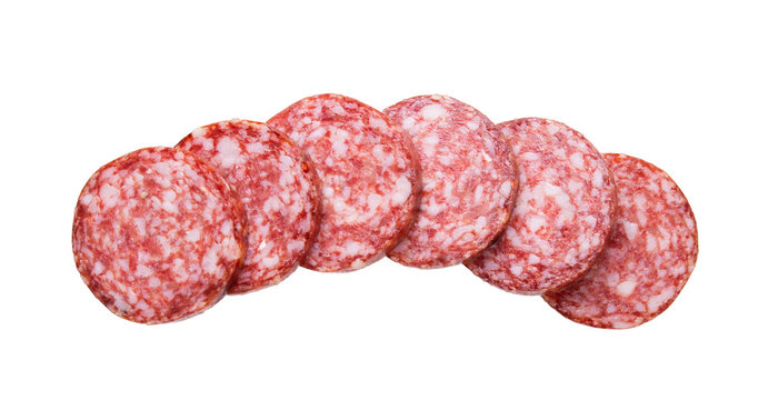 Salami smoked sausage slices isolated on white background