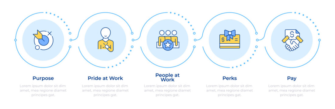 5P of employee fulfillment infographic 5 steps. Worker benefits, perks. Payment, salary. Flow chart infochart. Editable vector info graphics icons. Montserrat-SemiBold, Regular fonts used