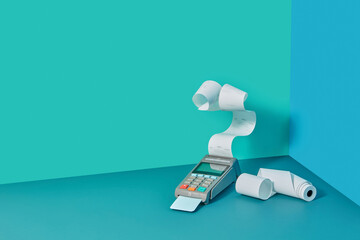 POS terminal with pay receipt and paper rolls.