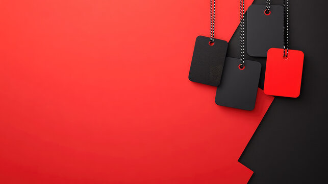 Minimalist design featuring black and red price tags on vibrant red background, perfect for sales and promotions. contrast creates striking visual appeal
