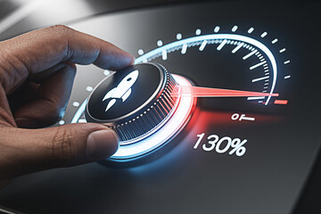 Hand adjusting a control knob with a rocket icon reaching 130 percent on a speedometer symbolizing growth success and high performance in business technology and achieving goals