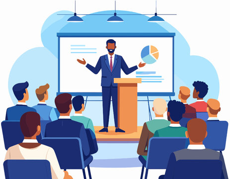 Business Presentation with Speaker and Audience in Blue Tones Illustration of Man Giving a Presentation on a Stage to Group of People in Auditorium