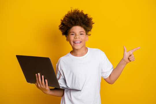 Smiling boy holding laptop and gesturing on bright yellow background showcasing cheerful learning and confidence
