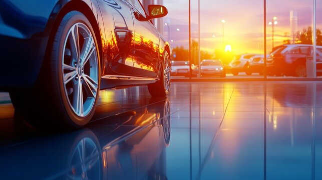 Sleek car showcased in a modern showroom at sunset, reflecting vibrant color on the floor