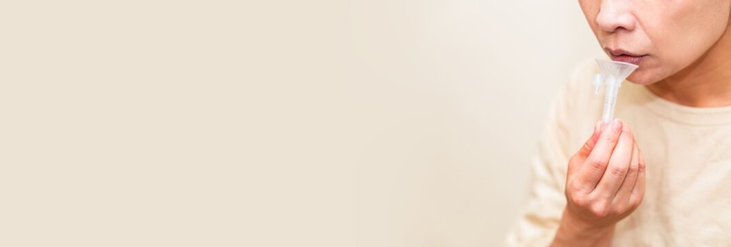 ATK Antigen test kit for COVID-19 saliva SARS CoV coronavirus at home. Kid Patient spit saliva for testing before back to school. People healthcare concept.