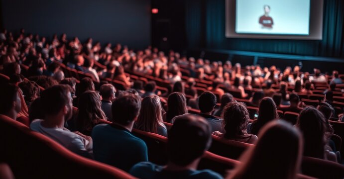 Un public assis dans un cinéma ou une salle de conférence regardant une vidéo d'entreprise sur un écran géant.