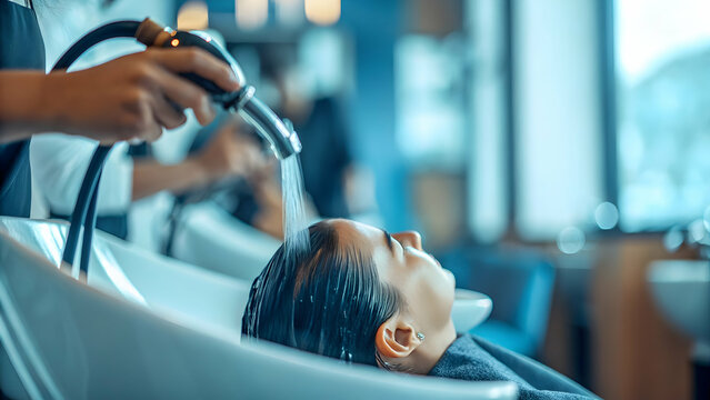 Hairstylist gently rinses salon client hair ensuring pampered atmosphere brand impression and hygienic grooming approach tied to personal flair concept as A modern parlour captures refreshing hair car