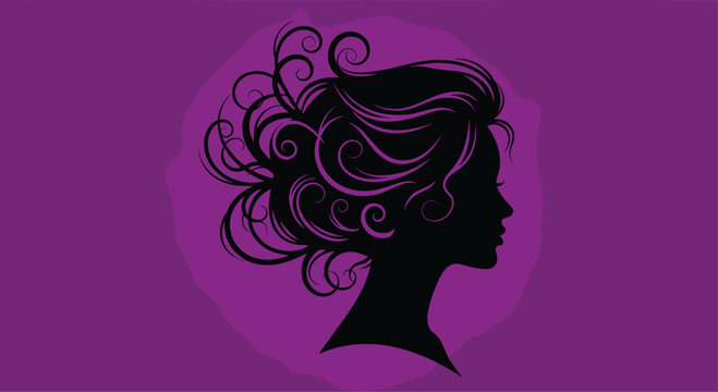 Elegant woman silhouette with flowing curls on vibrant purple background for beauty salon marketing stylish branding and fashion forward designs, Generative AI