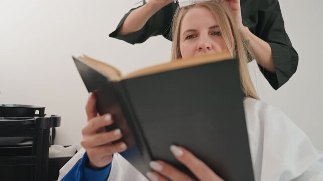 white woman reading book in salon, blonde client sits under cape while stylist braids strands, turning pages of novel, calm lighting, focused expression, modern minimal decor, tools and clips