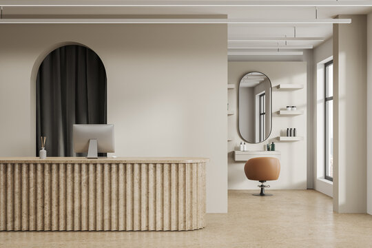 Beige modern barbershop interior with reception desk, computer and mock up wall