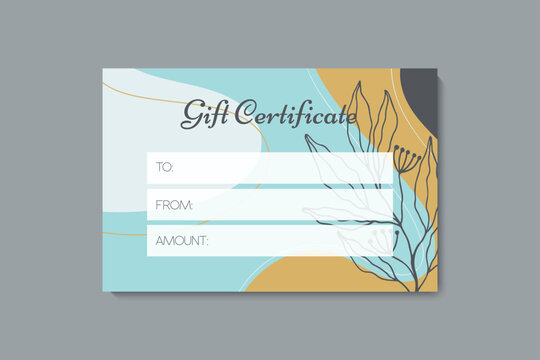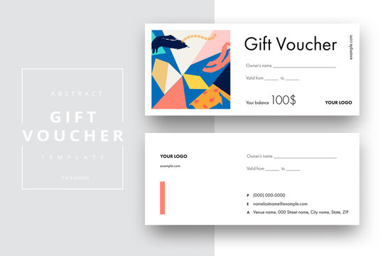 Abstract gift voucher card template. Modern discount coupon or certificate layout with geometric shape pattern. Vector fashion bright background design with information sample text.