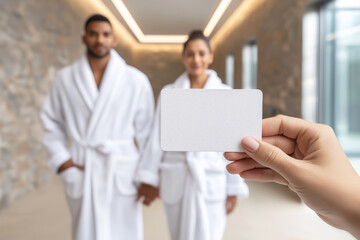 Gift certificate and gift card concept for a luxury spa salon with an elegant couple in white bathrobes, romantic wellness experience, premium voucher design for relaxation and couples services