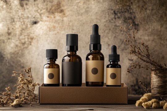 Minimalist Beauty Box Display with Natural Cosmetic Bottles and Essential Products for Skincare and Salon Treatments