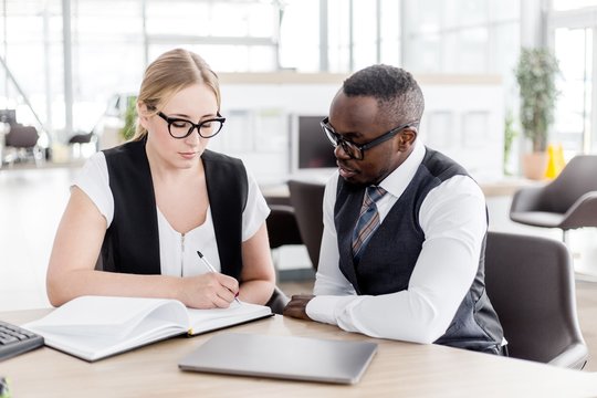 Business woman enters into a contract with an African man sitting at a table in the office