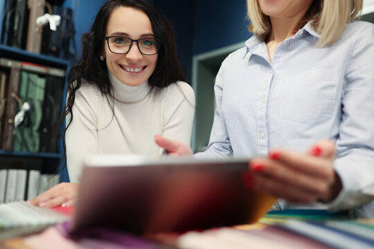 Woman designer showing project on digital tablet in curtain salon