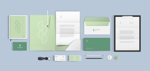 Vector green organic eco corporate identity brand. Template for vegan shop, spa salon or cosmetic firm. Realistic mockup pure color light style.