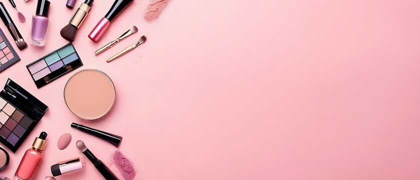 Beauty salon banner design template. Makeup cosmetic products on pastel background. Top view with copy space