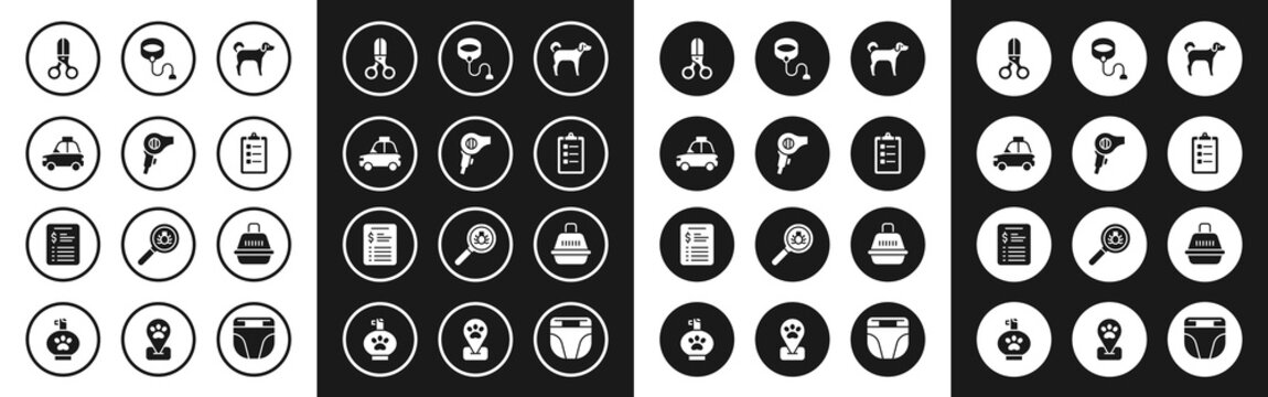 Set Dog, Hair dryer, Pet car taxi, Scissors hairdresser, Grooming salon price list, Retractable cord leash, carry case and icon. Vector