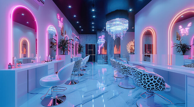 Beauty salon design in futurism and neon style, crystal, leopard chandelier.