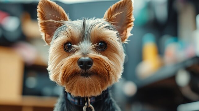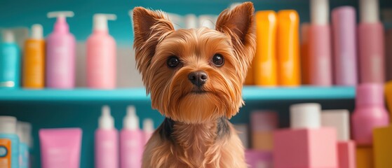 Groomed Yorkie among beauty supplies, pampered pet, sharp focus, grooming day, colorful array