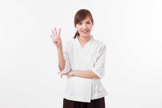 woman spa therapist pointing up 4 fingers, counting, numbering