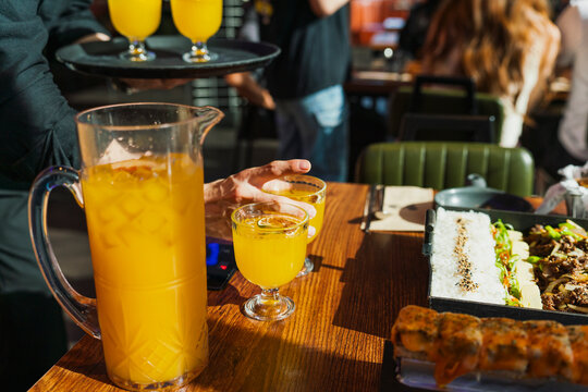 A bartender pouring a vibrant margarita into a chilled coupe glass, orange peel twist and salt rim visible, moody bar lighting with elegant presentation and negative space.