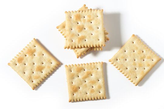 Eye level view of small stack of saltine or soup crackers, also known as soda crackers over white.