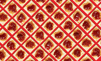 Diagonal View of Soda Crackers with Peanut Butter and Jam